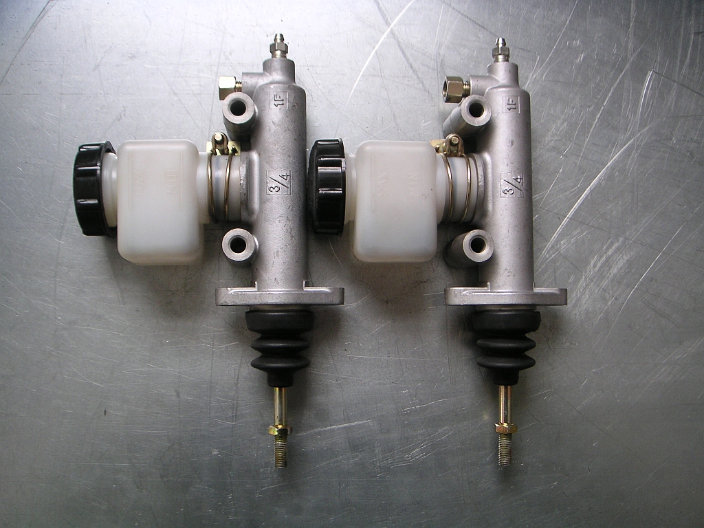 2 ks brake pump Wilwood 3/4", téměř nové, pro sestavu dual brake cylinder s váhou (nebo spojku), vhodné pro 4-6 pístkové brzdiče či velké dvoupísty s pedal ratio 7-9:1 bez boosteru, 6-7:1 s 7" boostrem či 5-6:1 s 9" (běžný) posilovačem...kus 1800 kč, oba 3000..