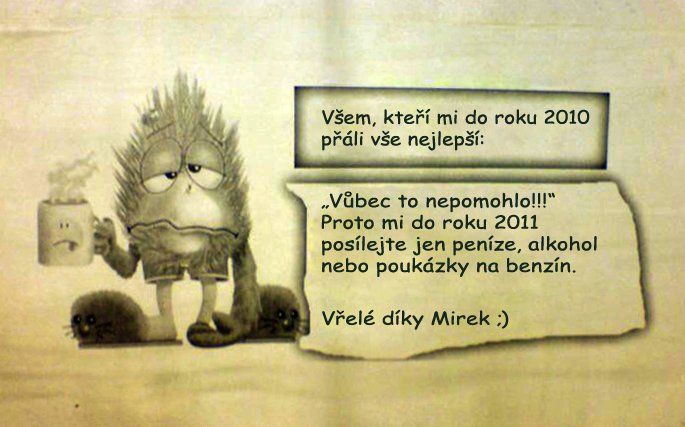Preji vsem do noveho roku hodne zdravi, penez, ujetych kilometru a co nejmene zavad. At se rok 2011 povede mnohem lepe nez rok 2010 :)