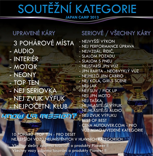 soutěžních kategorií bude tradičně větší než malé množství - dopoporučujem mrknout na jejich seznam: http://www.japancamp.cz/souteze-2013/ Měříme výfuky, audia a třeba se nám někdo i vysleče a samozřejmě tradiční pohár za nej zvuk emisí